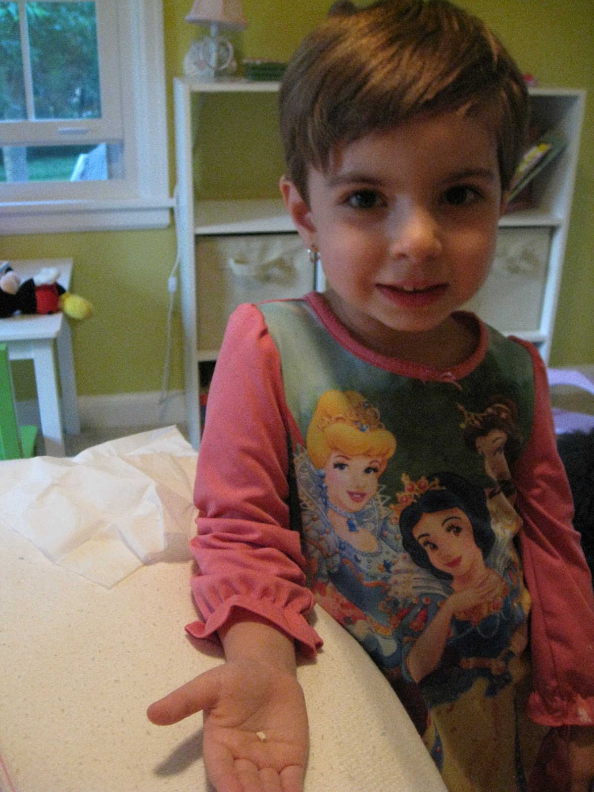 Two days later that second tooth was just as loose, hanging by less than a thread. I took her upstairs to try to encourage her to pull it out with a tissue, which she wouldn't. So I went in for it and it immediately came out. But I kept that tidbit to myself while she hollered that she didn't want me to do it. So I asked her to check out her smile in the mirror: